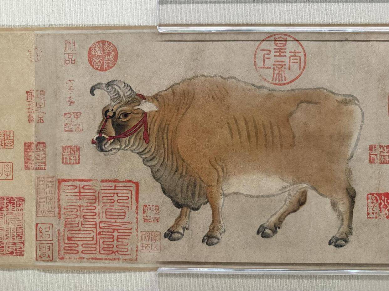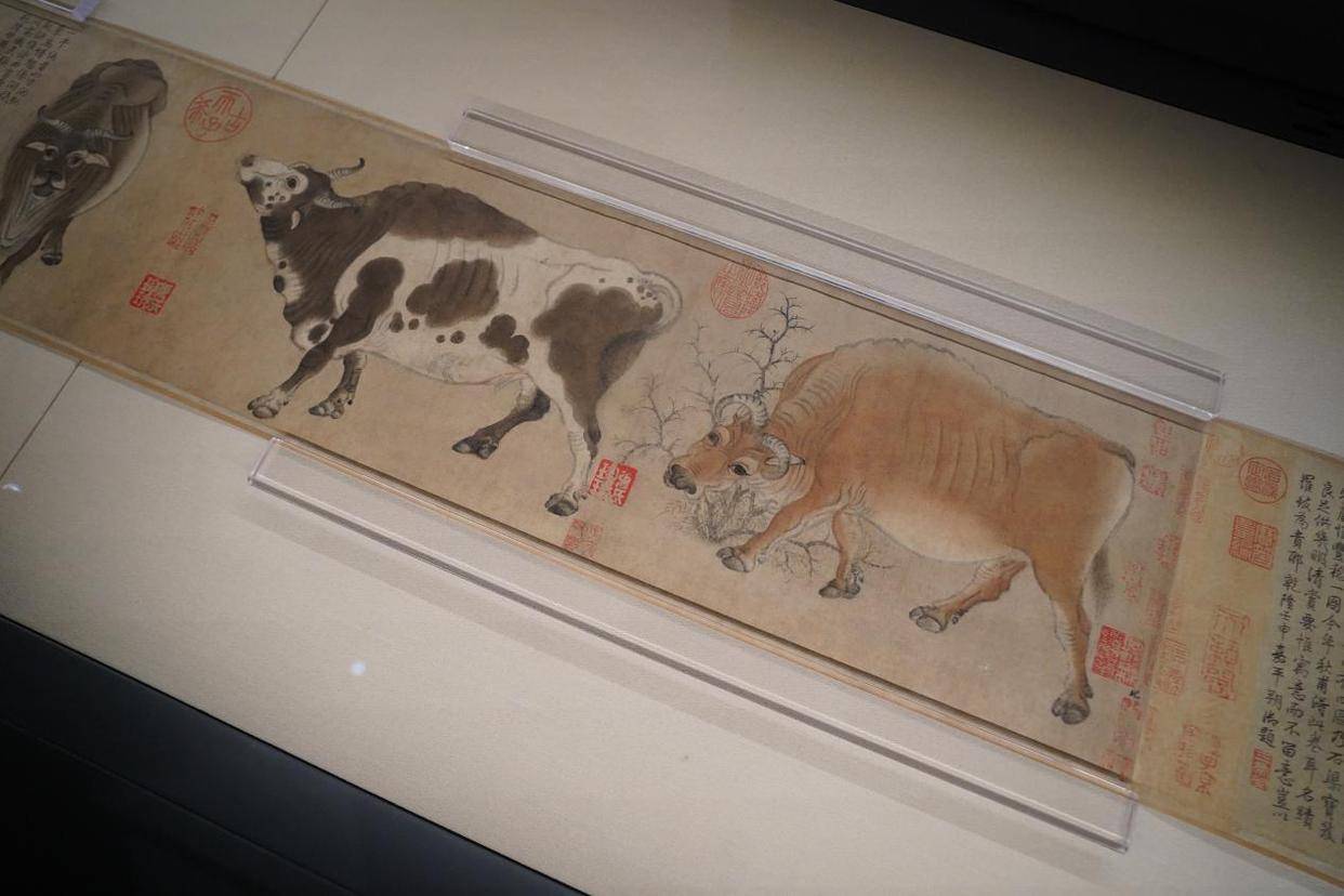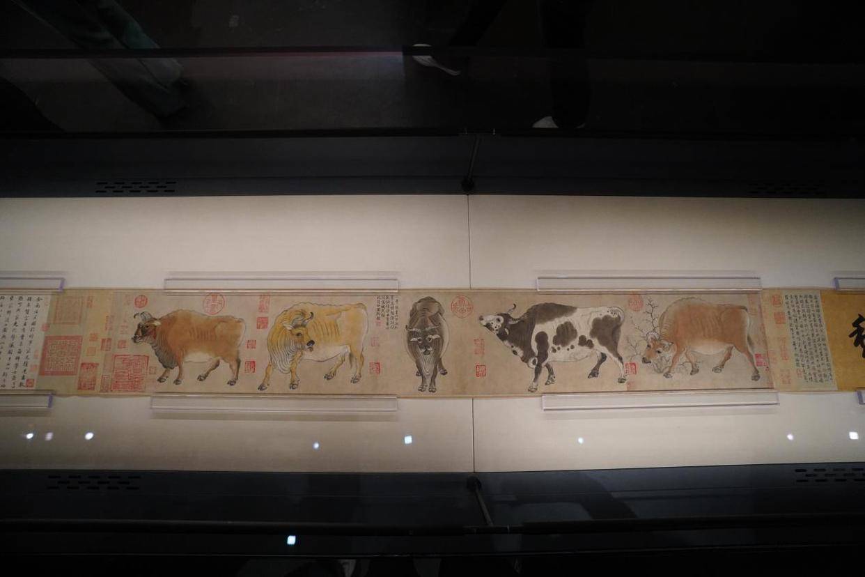 图中画牛五头,形象姿态各异,或依棘搔痒,或昂首低鸣,或悠然信步,或回首顾盼。最后一黄牛头上还束/p>