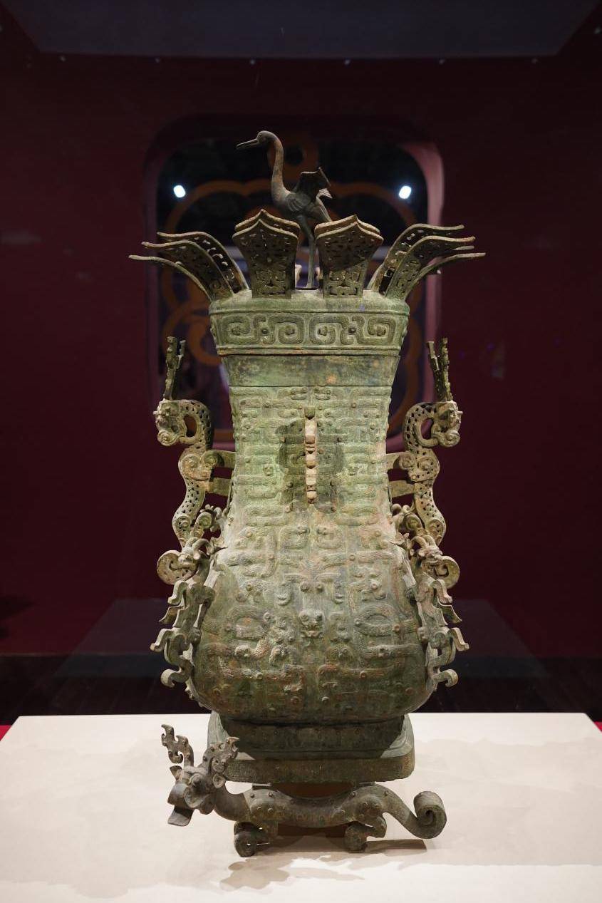 方壶形体巨大。双层镂雕莲瓣盖上立有一只展翅欲飞的仙鹤,壶身两侧为镂空双龙耳。壶体四面以蟠龙纹为主体纹饰,腹部四角各铸一飞龙,圈足下以两只伏虎承器。