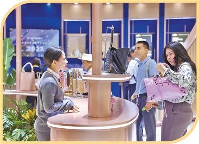 消博会免税与高端精品展区,参展人员在选购产品。